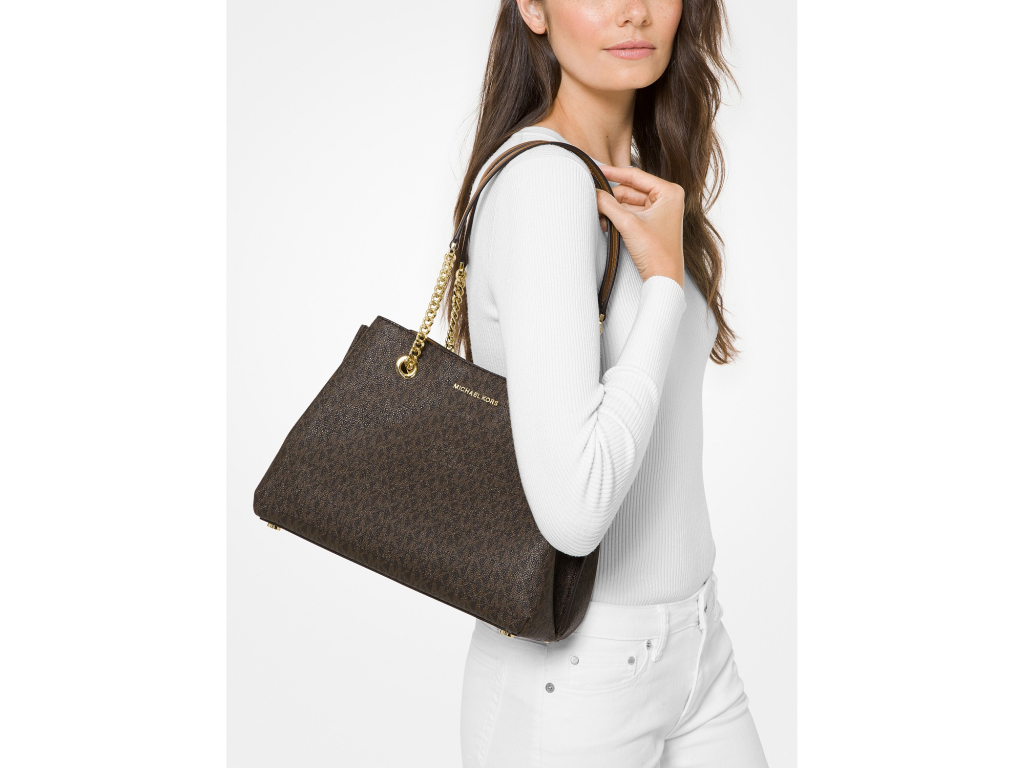 Michael Kors Kabelka Teagan Signature Long Drop Satchel Brown Acorn Gold
